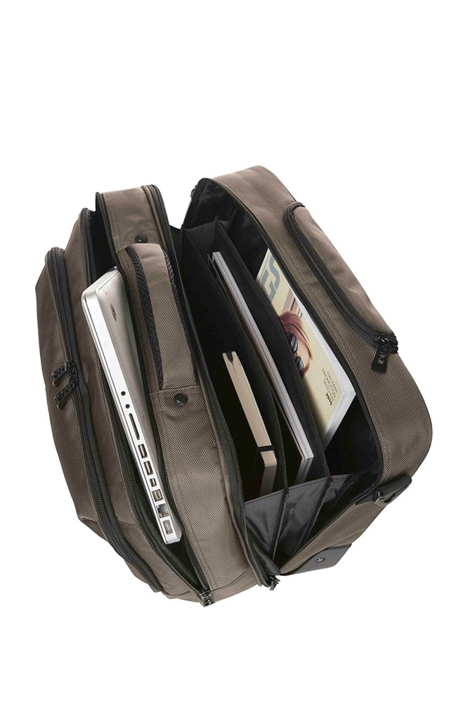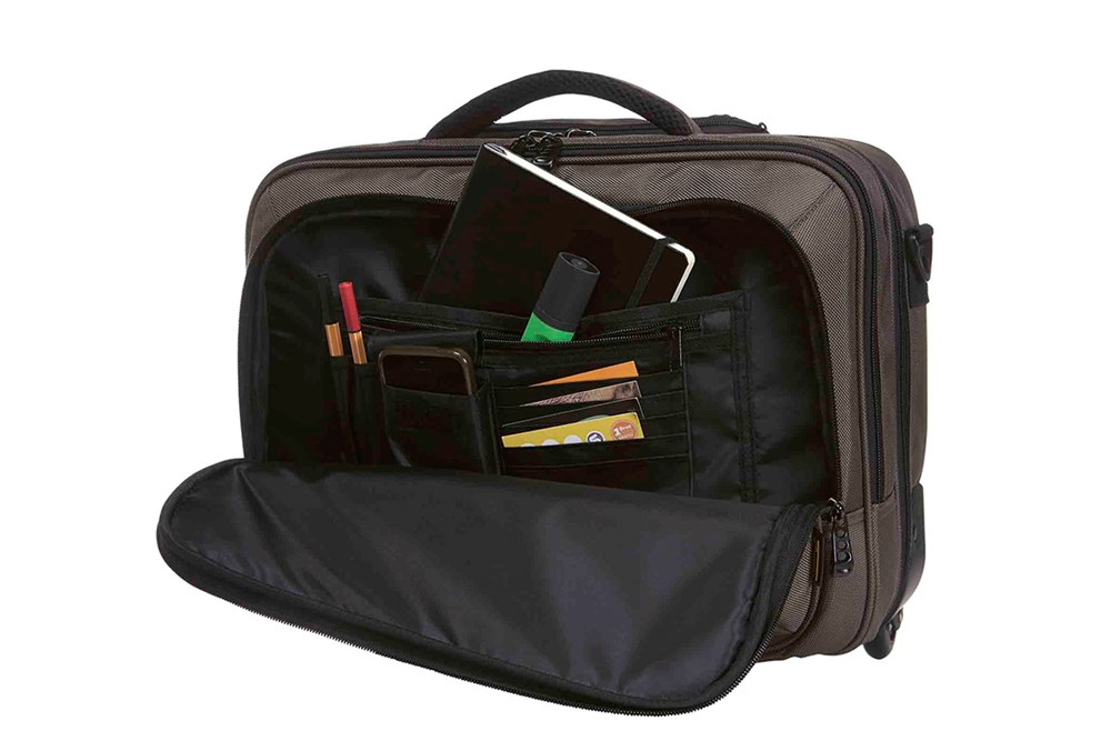 aufwändig gepolsterter Laptop-Trolley; Reißverschlussfach für Notebook; Dokumenten-Reißverschlussfach mit Separation; Reißverschluss-Vortasche mit Organizer-Elementen; Reißverschluss-Vortasche; Handgriff; abnehmbarer, zweiseitig längenverstellbarer Schultergurt mit genähtem Schulterpolster; rückseitige Befestigungsschlaufe für Gepäck-Trolley; Teleskopgriff